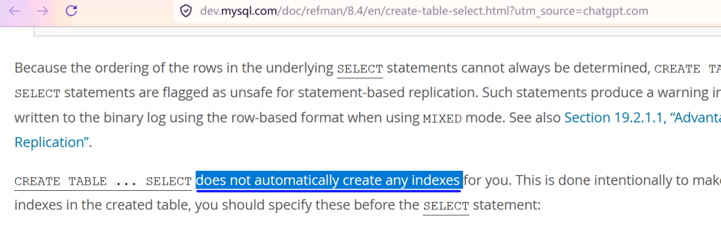 官方明确写了:CREATE TABLE ... SELECT does not automatically create any indexes